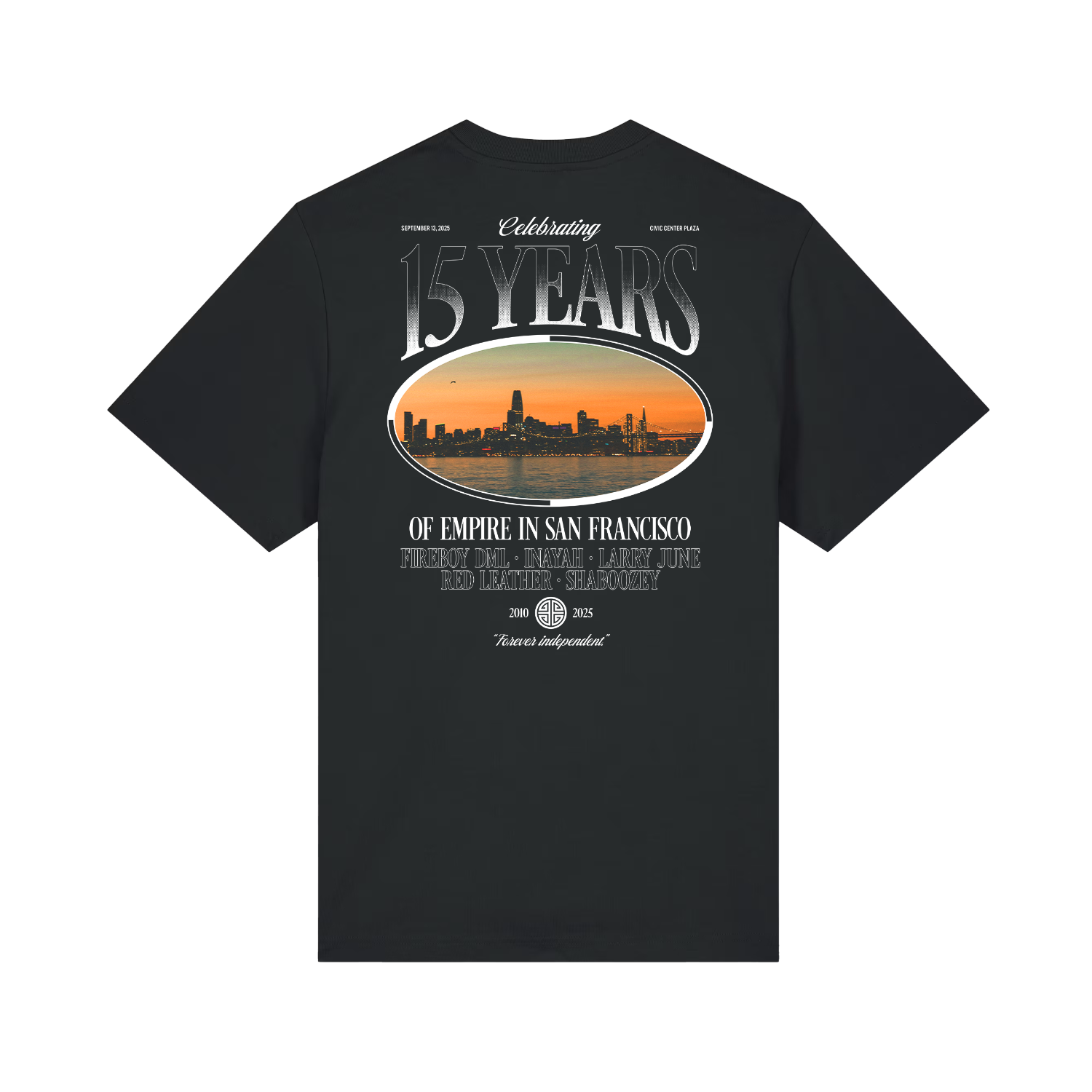 Celebrating 15 Years in San Francisco! Originally released at our anniversary show in Civic Center Plaza with Shaboozey, Larry June, Fireboy DML, Red Leather & Inayah, our EMPIRE 15 Merch Capsule is now available online in limited quantities.
